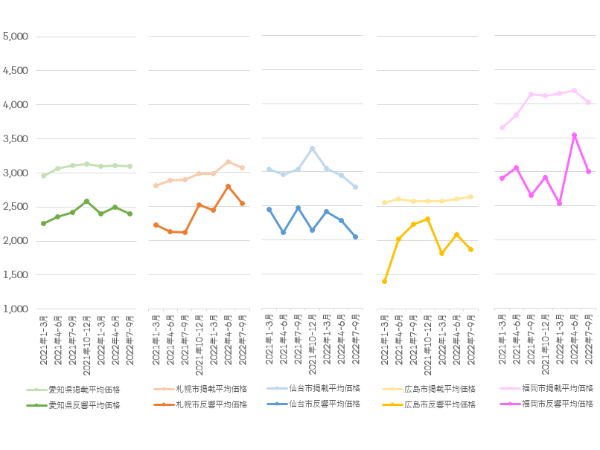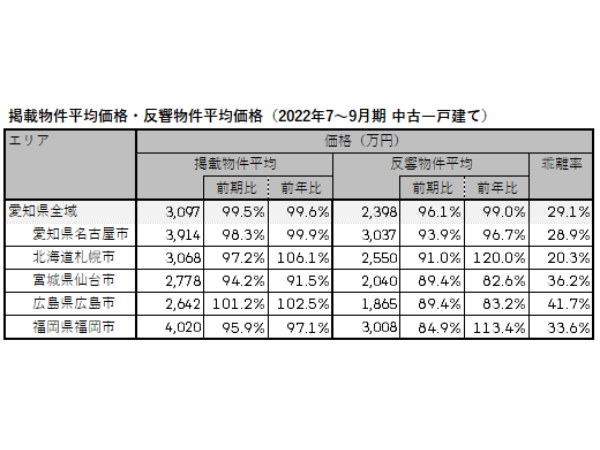 対する直近1年の反響物件平均価格も、いずれも上下動はありながらも横ばい傾向となっている。2022年7~9月期の反響物件平均価格は、愛知県全域が2,398万円で前期比96.1%、札幌市が2,550万円で同91.0%、仙台市が2,040万円で同89.4%、広島市が1,865万円で同89.4%、福岡市が3,008万円で同84.9%と、いずれのエリアでも下落。掲載物件平均価格との乖離が広がり、特に広島市では乖離率41.7%と大きく乖離した。