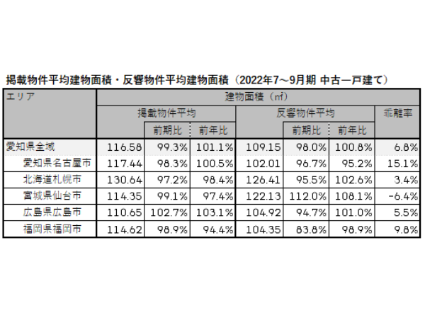 足元の2022年7~9月の動きでは、愛知県全域が116.58m2で前期比99.3%、札幌市が130.64m2で同97.2%、仙台市が114.35m2で同99.1%、広島市が110.65m2で同102.7%、福岡市が114.62m2で同98.9%と、掲載平均価格同様に広島市を除くエリアで縮小した。