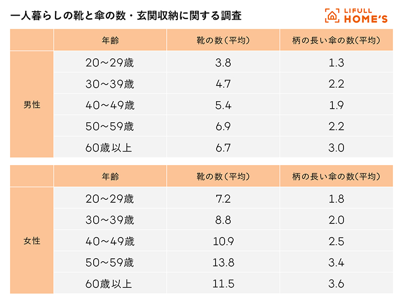 続いて年代・性別で傾向を見てみよう。靴の数、傘の数ともに最も持っている数が少なかったのは男性、女性ともに20代で、男性は靴の数の平均が3.8足、女性は7.2足。傘の数は男性1.3本、女性1.8本だった。