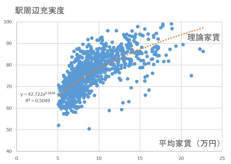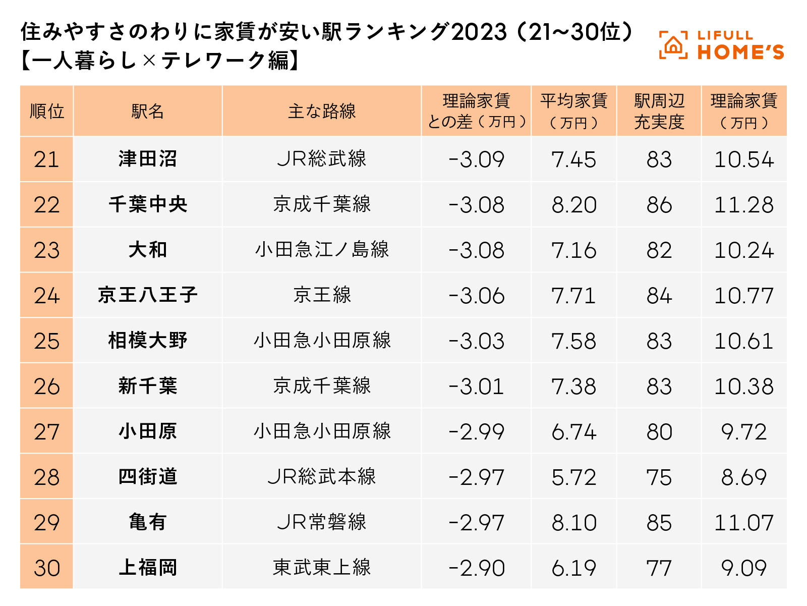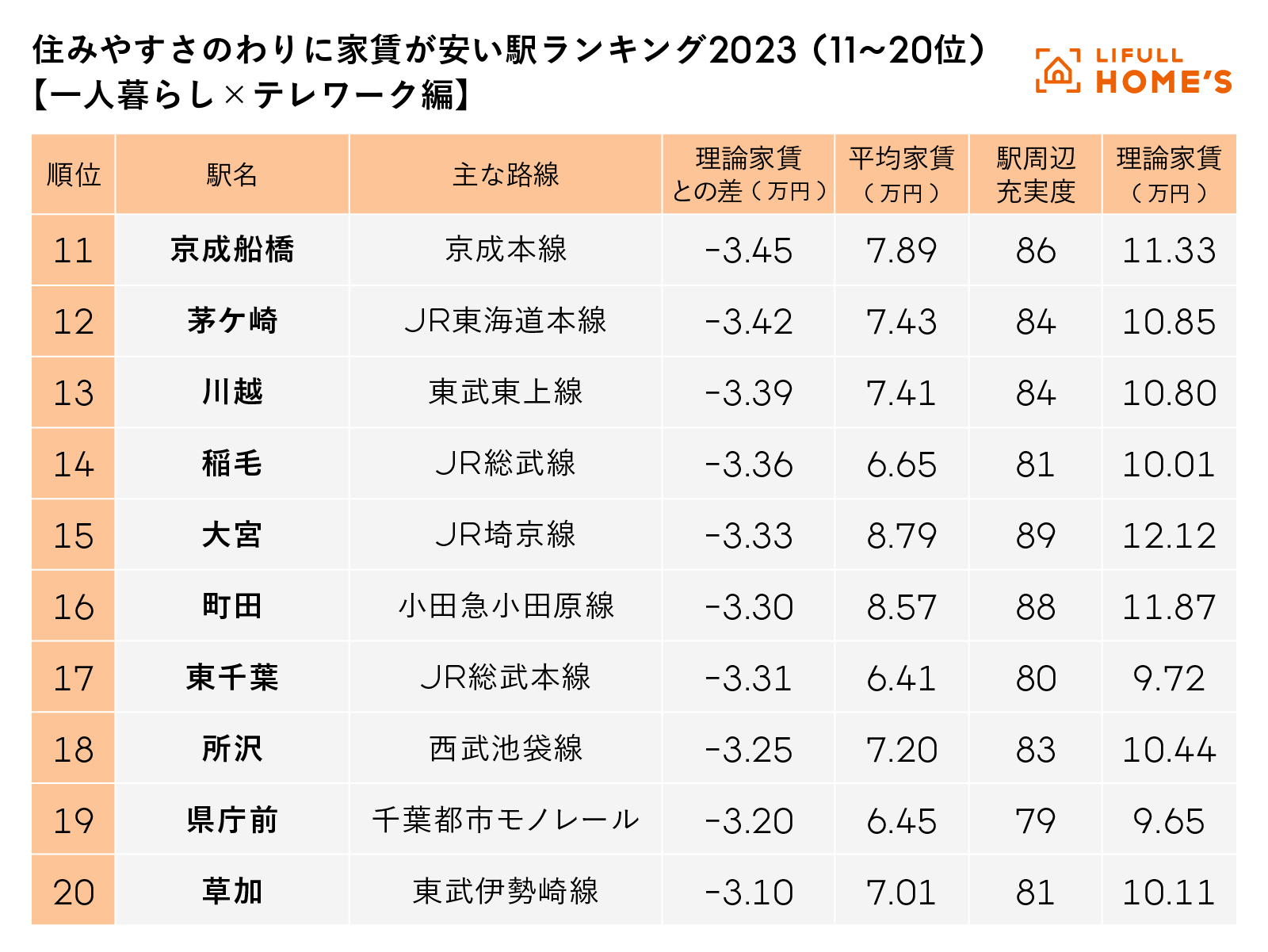 また、「駅周辺の施設充実度(※2)が高い」ことを「住みやすい」と定義し、不動産・住宅情報サイトLIFULL HOME'Sの独自データをもとに、各駅から徒歩15分圏内の単身世帯用物件の平均家賃とその駅周辺の施設充実度から「理論家賃(駅周辺の住みやすさに見合う妥当な家賃)」を算出。その理論家賃と比べて実際の平均家賃が安い駅をランキングにした。 これはテレワーク中心のライフスタイルを想定した際に、「住環境が優れているわりに、家賃を抑えて一人暮らし用の物件を借りられる駅」を表しているといえる。