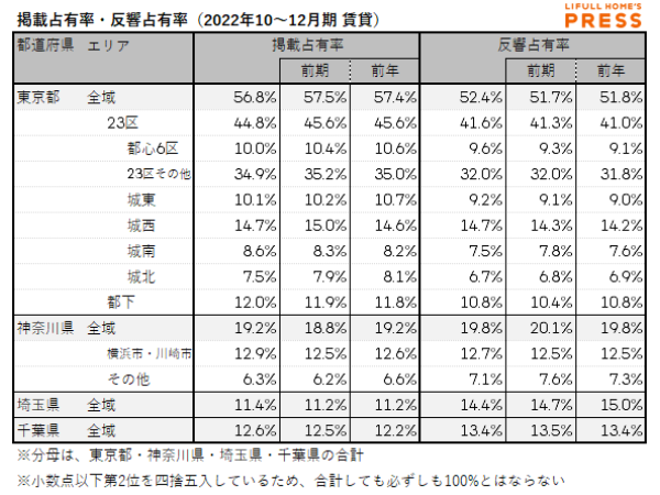 2022年10~12月期の首都圏賃貸物件市場における、各エリアの掲載占有率および反響占有率は以下の通り。