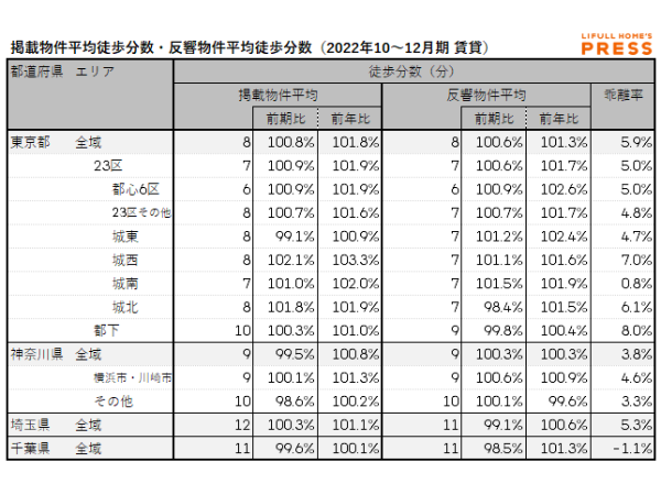 2022年10~12月期の首都圏賃貸物件の掲載物件平均徒歩分数および反響物件平均徒歩分数は以下の通り。