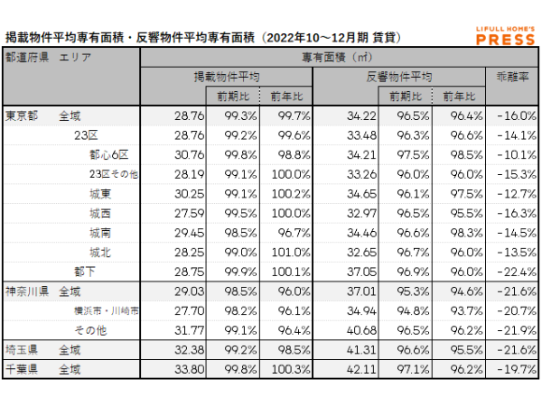 2022年10~12月期の首都圏賃貸物件の掲載物件平均専有面積および反響物件平均専有面積は以下の通り。