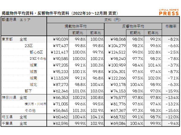 2022年10~12月期の首都圏賃貸物件の掲載物件平均賃料および反響物件平均賃料は以下の通り。