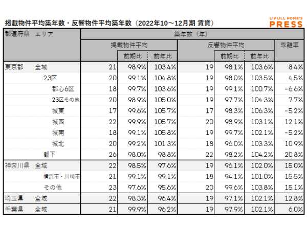 2022年10~12月期の首都圏賃貸物件の掲載物件平均築年数および反響物件平均築年数は以下の通り。