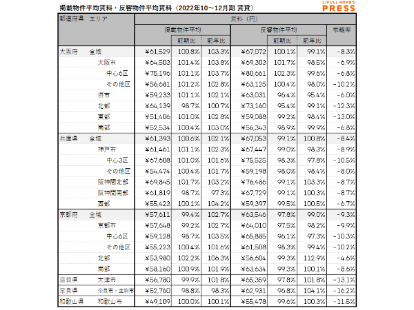 2022年10~12月期の近畿圏賃貸物件の掲載物件平均賃料および反響物件平均賃料は以下の通り。