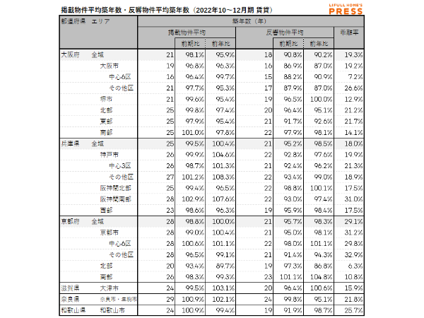 2022年10~12月期の近畿圏賃貸物件の掲載物件平均築年数および反響物件平均築年数は以下の通り。