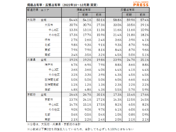 2022年10~12月期の近畿圏賃貸物件市場における、各エリアの掲載占有率および反響占有率は以下の通り。