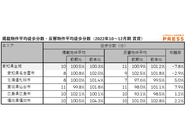 2022年10~12月期の愛知県および地方4市(札幌市、仙台市、広島市、福岡市)の賃貸物件の掲載物件平均徒歩分数および反響物件平均徒歩分数は以下の通り。