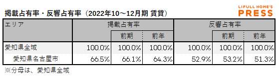 2022年10~12月期の愛知県の賃貸物件市場における、各エリアの掲載占有率および反響占有率は以下の通り。