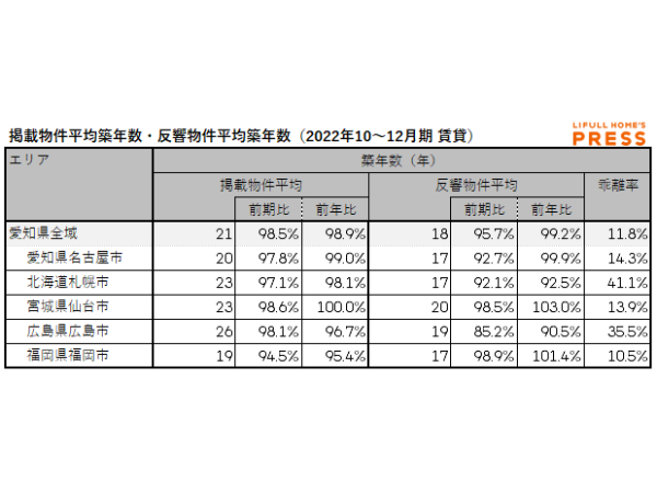 2022年10~12月期の愛知県および地方4市(札幌市、仙台市、広島市、福岡市)の賃貸物件の掲載物件平均築年数および反響物件平均築年数は以下の通り。