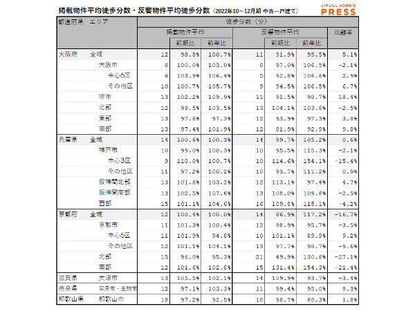 2022年10~12月期の近畿圏中古一戸建ての掲載物件平均徒歩分数および反響物件平均徒歩分数は以下の通り。