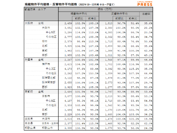 掲載物件平均価格は大阪府が2,459万円で前年比108.1%・前期比102.9%、兵庫県が2,267万円で前年比101.9%・前期比100.6%、京都府が2,684万円で前年比96.9%・前期比101.5%となっている。