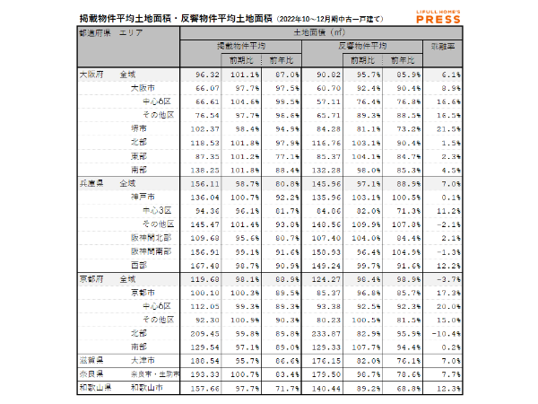 2022年10~12月期の近畿圏中古一戸建ての掲載物件平均土地面積および反響物件平均土地面積は以下の通り。