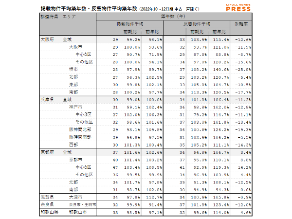 2022年10~12月期の近畿圏中古一戸建ての掲載物件平均築年数および反響物件平均築年数は以下の通り。