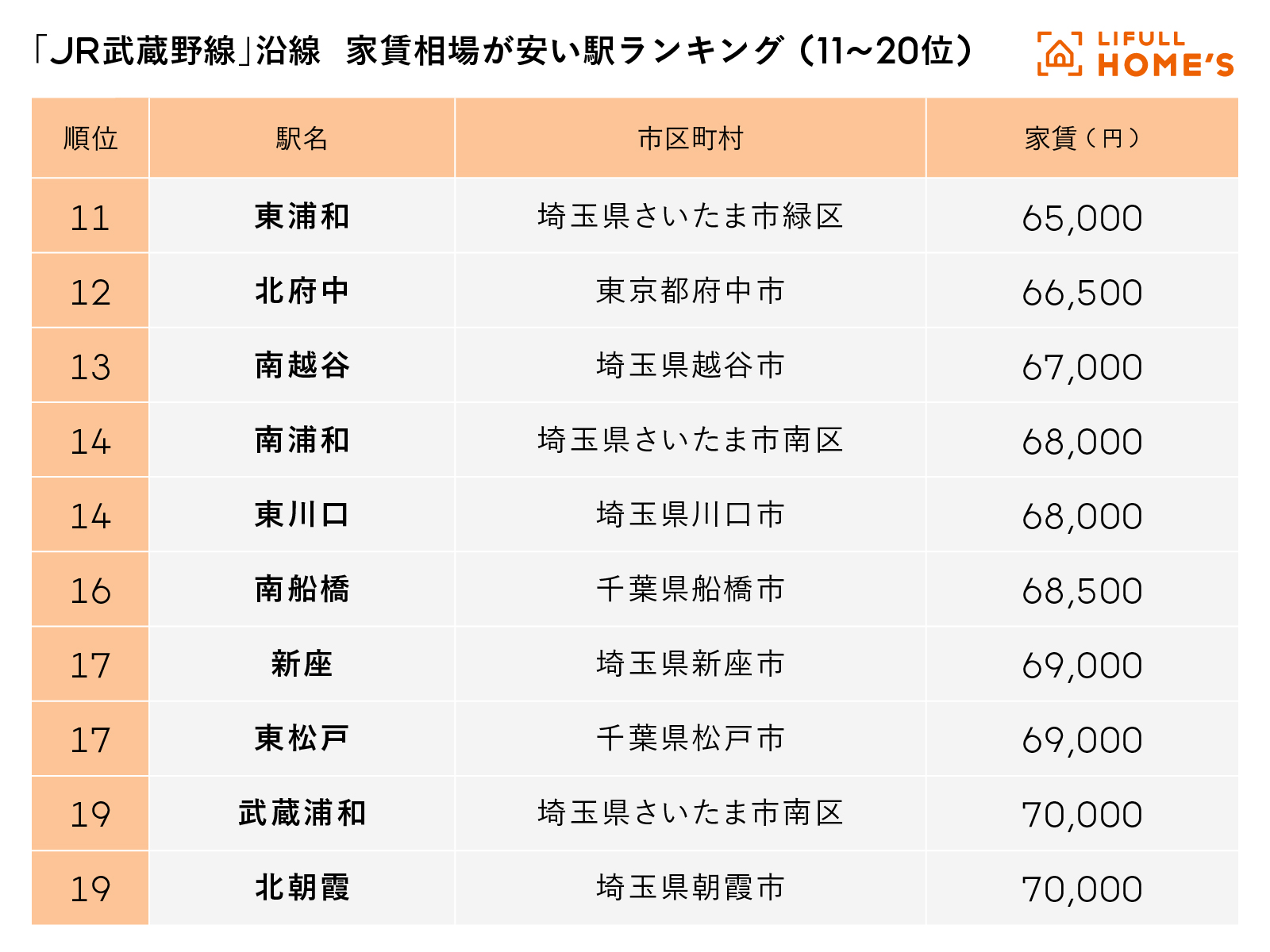「JR武蔵野線」沿線で家賃相場が安い駅ランキング、1位は千葉県市川市「市川大野」、2位は埼玉県所沢市「東所沢」、同順位には埼玉県さいたま市桜区「西浦和」、千葉県松戸市「新八柱」となった。千葉県4駅・埼玉県3駅・東京都3駅とエリアの大きな偏りはなく、各ターミナル駅の近隣駅が上位10駅にはまんべんなくランクインしている。