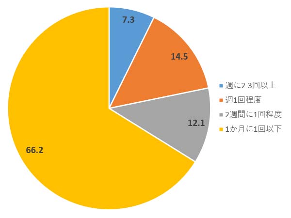 さらに、商店街に行く頻度について聞いてみた。「あなたが商店街へ行く頻度を教えてください」の質問に「週に2-3回以上」が7.3%、「週1回程度」14.5%、「2週間に1回程度」12.1%と、約3割(33.9%)の人が2週間に1回以上商店街に行っていることがわかった。