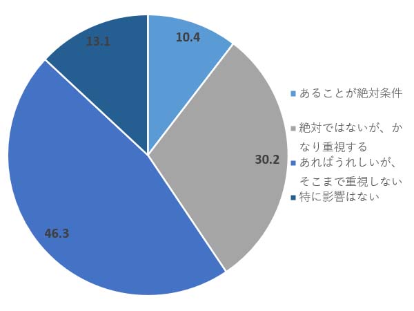 商店街に行く頻度は男性の方が多い傾向にあると前述したが、エリア選びについても、「あることが絶対条件」「絶対ではないが、かなり重視する」と回答した人の割合は男性46.3%、女性33.4%となっており、男性の方が住まい選びで商店街があることを重視する傾向にあるようだ。