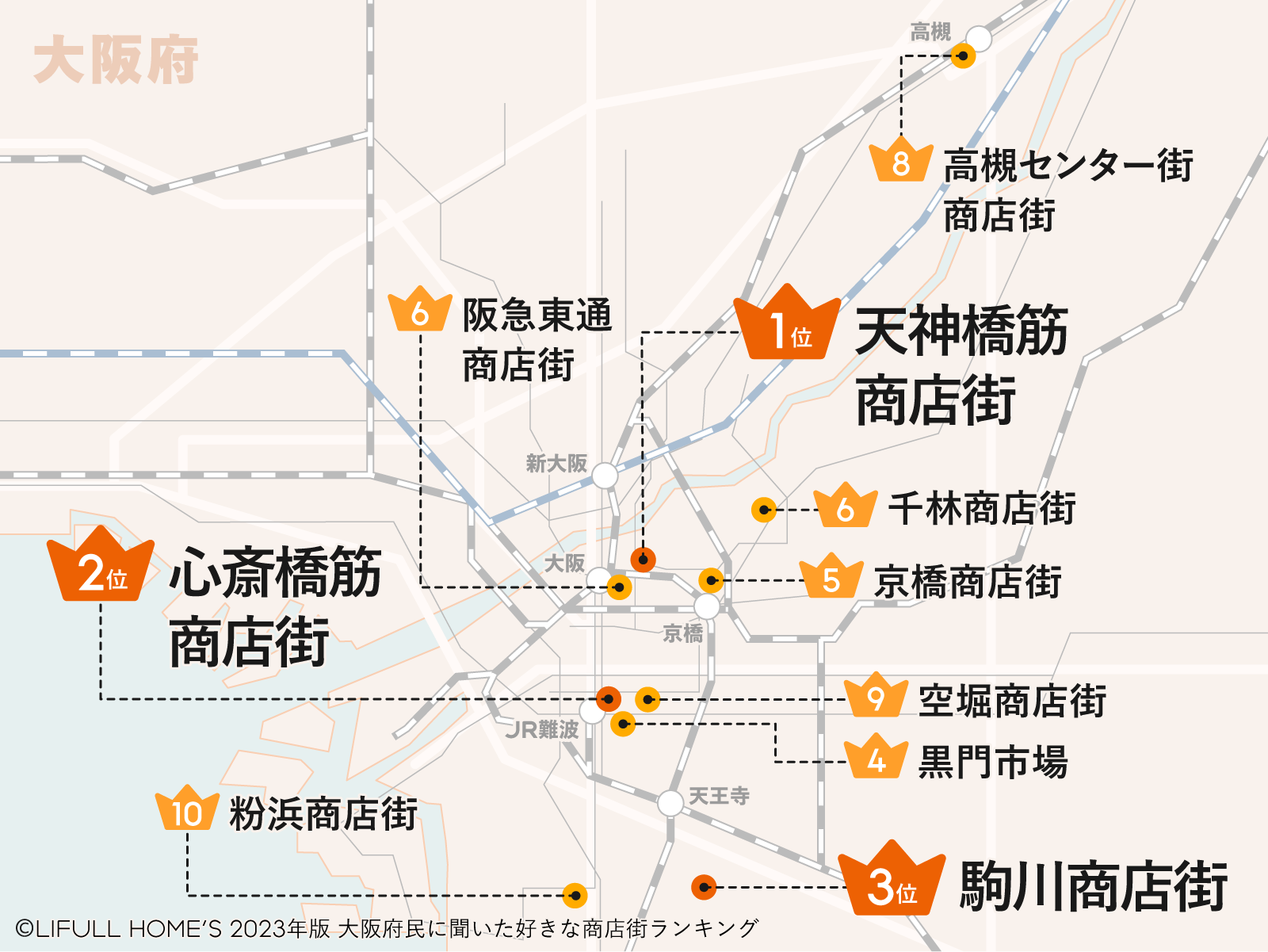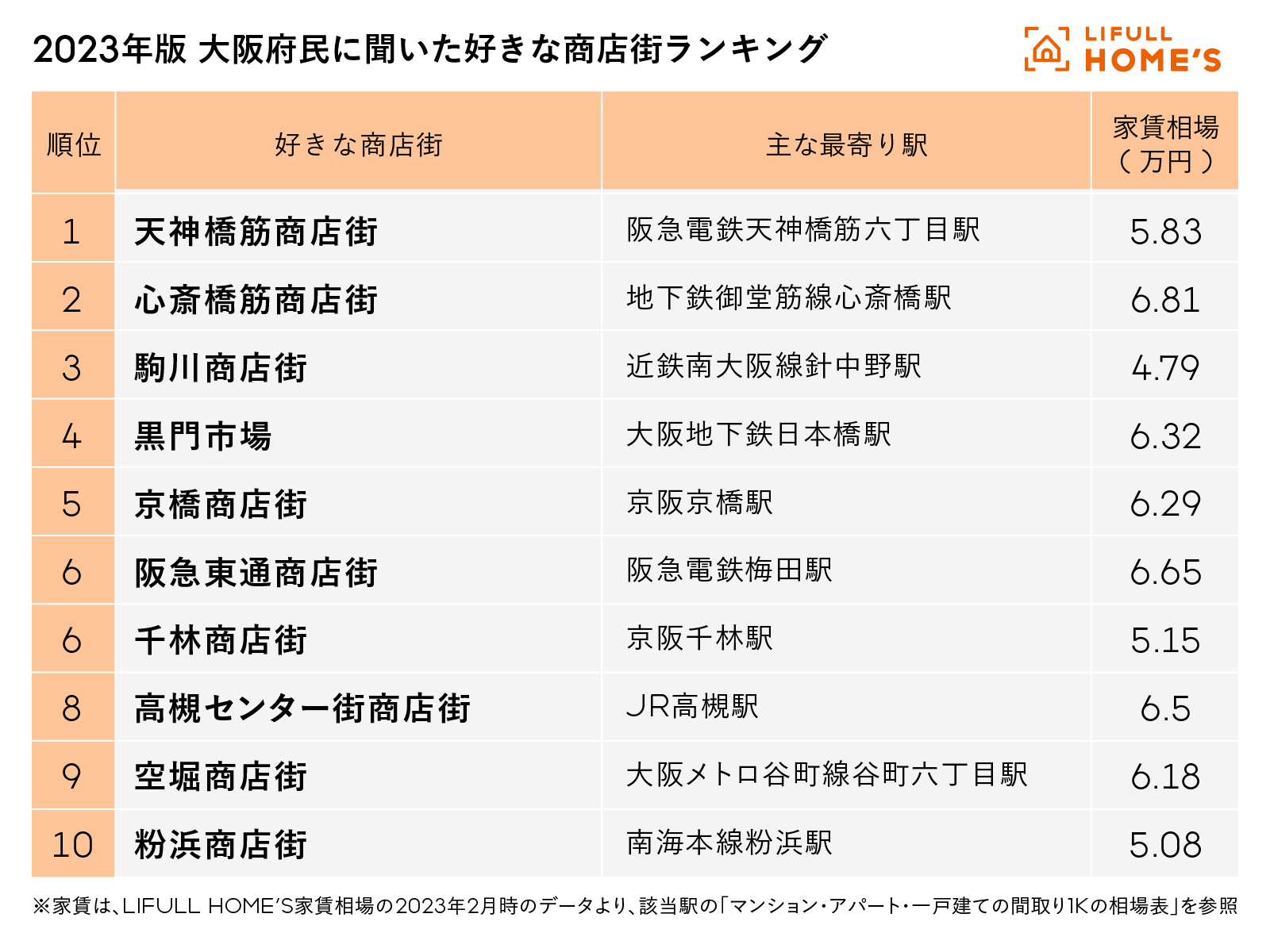 最後に、大阪府民の商店街好きが選んだ「最も好きな商店街トップ10」と併せて、主な最寄り駅の家賃相場をご紹介する。ほかにも住み替えで気になる駅がある人は、LIFULL HOME'S家賃相場を参照してみてほしい。