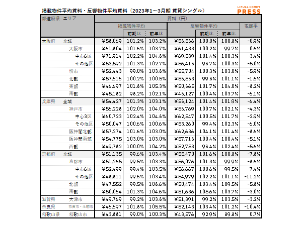 掲載物件平均賃料は大阪府が5万8,069円で前年比103.2%・前期比101.2%、兵庫県が5万4,427円で前年比103.1%・前期比101.3%、京都府が5万1,135円で前年比103.4%・前期比99.6%となっている。