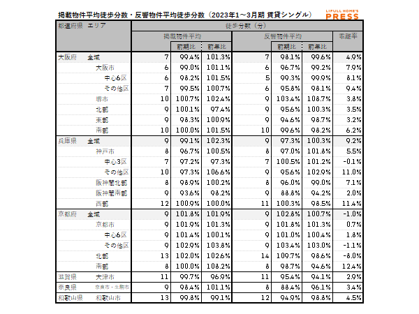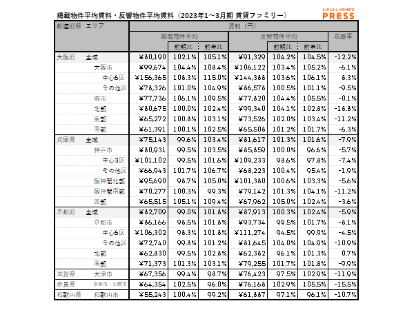 掲載物件平均賃料は大阪府が8万190円で前年比105.1%・前期比102.1%、兵庫県が7万5,143円で前年比103.4%・前期比99.6%、京都府が8万2,709円で前年比101.8%・前期比99.0%となっている。
