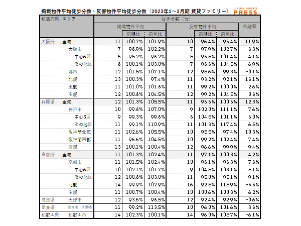 一方、反響物件平均賃料は、大阪府が5万8,586円で前年比100.8%・前期比100.0%、兵庫県が5万8,124円で前年比101.9%・前期比101.4%、京都府が5万5,470円で前年比100.8%・前期比101.6%となっている。