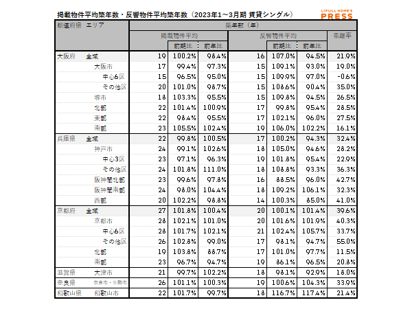 2023年1~3月期の近畿圏シングル向き賃貸物件の掲載物件平均築年数および反響物件平均築年数は以下の通り。