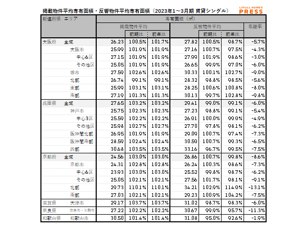 2023年1~3月期の近畿圏シングル向き賃貸物件の掲載物件平均専有面積および反響物件平均専有面積は以下の通り。
