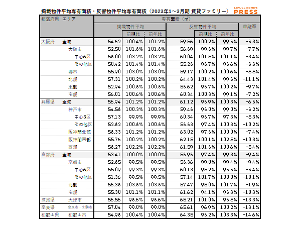 2023年1~3月期の近畿圏ファミリー向き賃貸物件の掲載物件平均専有面積および反響物件平均専有面積は以下の通り。
