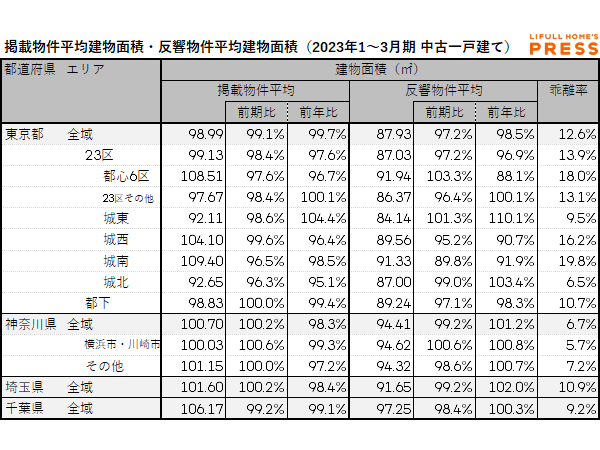 2023年1~3月期の首都圏中古一戸建ての掲載物件平均建物面積および反響物件平均建物面積は以下の通り。