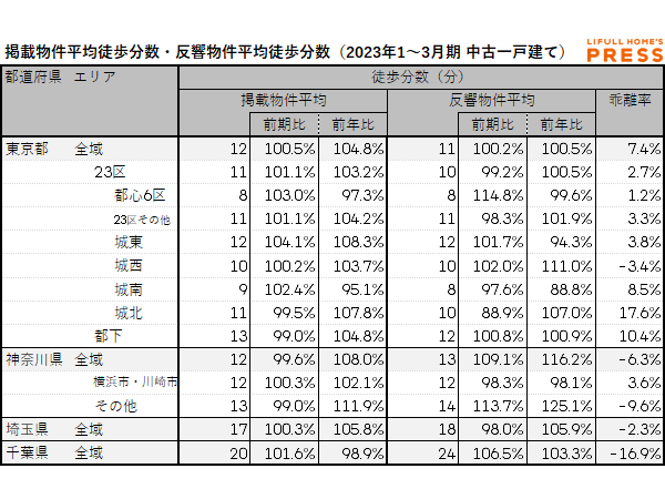 2023年1~3月期の首都圏中古一戸建ての掲載物件平均徒歩分数および反響物件平均徒歩分数は以下の通り。