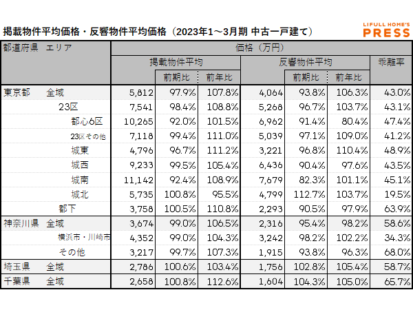 2023年1~3月期の首都圏中古一戸建ての掲載物件平均価格および反響物件平均価格は以下の通り。