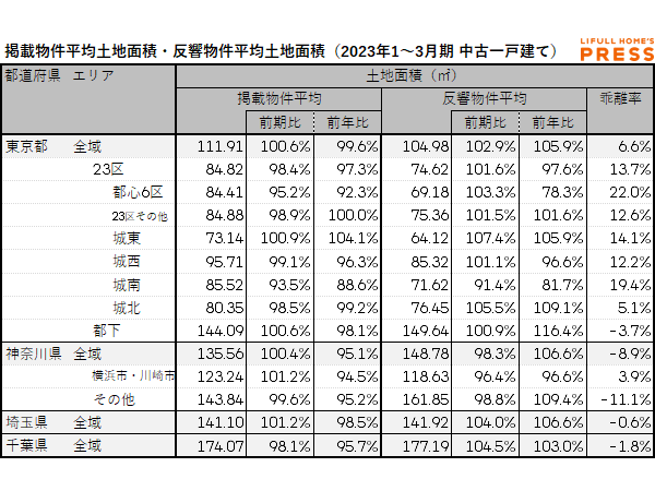 2023年1~3月期の首都圏中古一戸建ての掲載物件平均土地面積および反響物件平均土地面積は以下の通り。