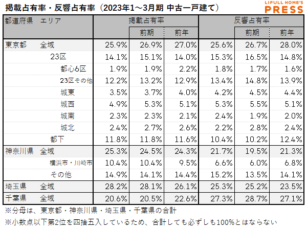 2023年1~3月期の首都圏中古一戸建て市場における、各エリアの掲載占有率および反響占有率は以下の通り。