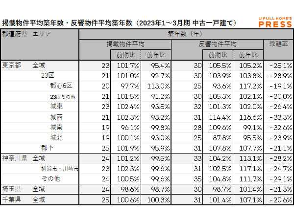 2023年1~3月期の首都圏中古一戸建ての掲載物件平均築年数および反響物件平均築年数は以下の通り。