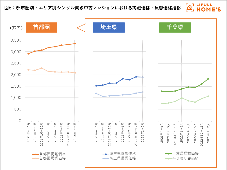 2023年1~3月期のシングル向き中古マンションの掲載平均価格は、首都圏全体が3,352万円(前期比101.2%・前年比105.5%)で1年以上上昇傾向が続く。一方で反響平均価格は2,081万円(前期比98.2%・前年比96.9%)と下落しており、掲載価格との乖離が広がっている。エリア別の掲載価格では、「埼玉県」が1,898万円(前期比99.4%・前年比115.6%)、「千葉県」が1,830万円(前期比114.7%・前年比131.6%)と、東京都と比べて物件数こそ多くはないが、両県で特に顕著な上昇がみられる。