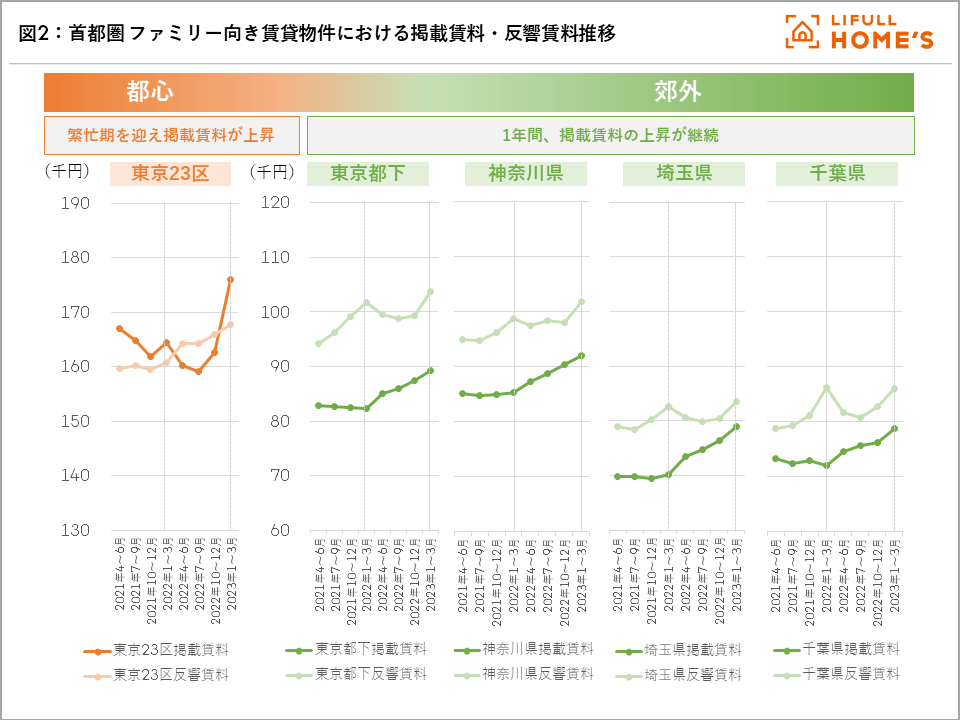トピックス①【ファミリー向き賃貸物件】は直近1年首都圏郊外で掲載賃料の上昇傾向が続く