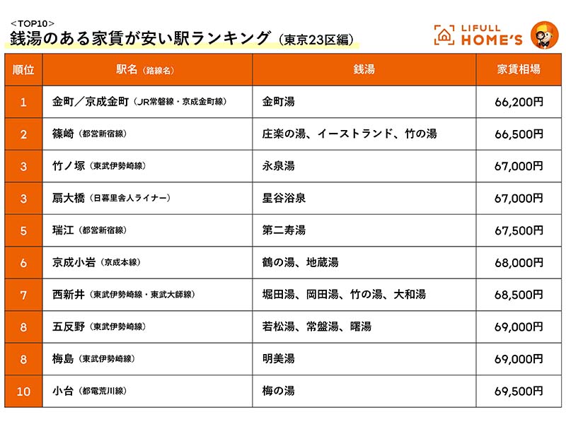 そこでLIFULL HOME'Sでは、東京都浴場組合に加盟する銭湯がある駅の、一人暮らし向け物件の家賃相場を算出し、「銭湯のある家賃が安い駅ランキング(東京23区編)」を作成した。住まい探しの参考にしていただけると幸いだ。さらに、毎日違った銭湯を楽しみたいという人もいるかもしれない。そういった人に向けて「銭湯が多い駅ランキング(東京23区編)」も作成したので、あわせてお読みいただきたい。