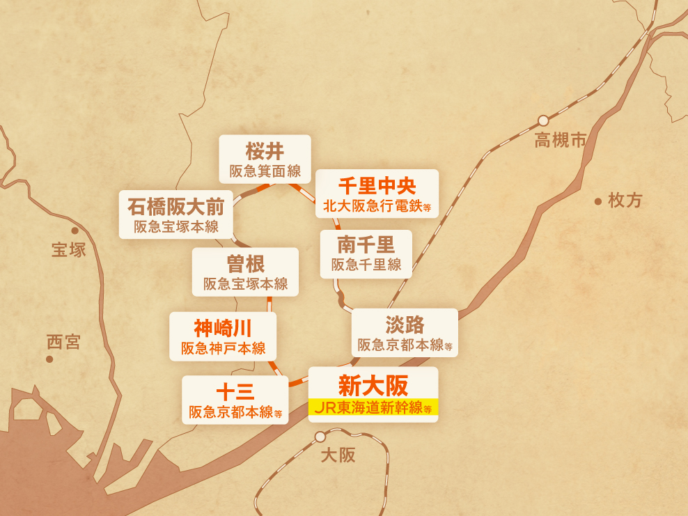 1948(昭和23)年、当時小型車が走っていた京阪神急行電鉄(現 阪急電鉄)宝塚本線の混雑を緩和しようと、大型車で神戸本線に乗り入れるために宝塚本線曽根駅~神戸本線神崎川駅の免許を取得するも、実現していなかった。その後1961(昭和36)年に宝塚本線の混雑緩和を目的に、淡路駅から北へ延びていた千里山線(現 千里線)の終点千里山駅と箕面線の桜井駅をつなぐ路線の免許を取得。現在の南千里駅(旧 新千里山駅)や千里中央駅を経て桜井駅へ至る計画で、1963年には千里山駅~新千里山駅を開通させた。また、1964年の東海道新幹線開業を前に、1961年には新幹線が発着する新大阪駅へのアクセスと京都本線の混雑緩和のため、十三駅~新大阪駅~淡路駅と、神崎川駅~新大阪駅の免許も取得しており、これによって新大阪駅~淡路駅~千里山駅~桜井駅~曽根駅~神崎川駅~新大阪駅の環状線計画が形作られた。