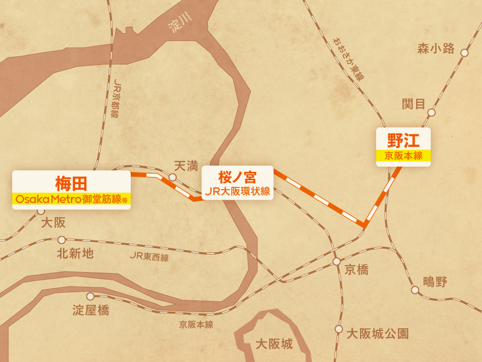当初は、新京阪線(現在の阪急京都本線)の都心乗り入れ経路として、鉄道省の城東線(現 JR大阪環状線)の高架化工事によって余った地上線を活用した梅田乗り入れを計画していた。しかし、地上線では都市計画の妨げになると大阪市からクレームが入り、さらに関東大震災が起こって関東の鉄道復興に予算が回されたことで城東線の高架化は見送りに。京阪の計画もストップした。その後、野江駅の先の蒲生信号場から分岐し梅田駅に乗り入れる「京阪梅田線」として計画は残ったものの、1942(昭和17)年に免許を失効。阪急に移管された新京阪線が現在のルートで梅田乗り入れを果たした一方、京阪本線はその後も市内中心部への乗り入れを模索し続けることとなる。後年、市営モンロー主義の緩和を受け、御堂筋線と接続する淀屋橋駅まで延伸して悲願の都心乗り入れを実現したが、「京阪電車から乗り換えなしで梅田まで行けるのは、とても魅力的」(アンケートより)と、京阪電車の梅田乗り入れを願う声は今も根強い。