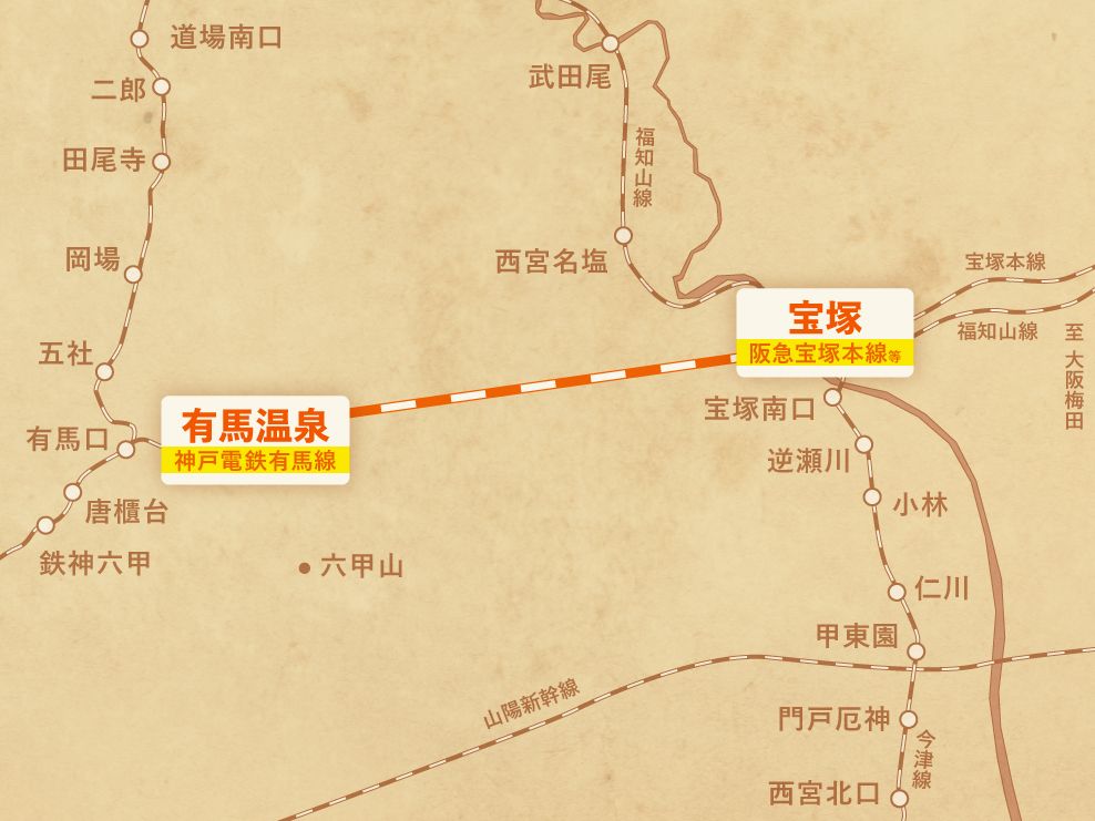 阪急電鉄の前身である箕面有馬電気軌道は、1906(明治39)年に梅田~宝塚、石橋~箕面、宝塚~西宮、宝塚~有馬の特許を取得し、現在の阪急宝塚本線、箕面線、今津線などを開業させたが、宝塚~有馬は開業しなかった。有馬には、日本三古泉のひとつ有馬温泉があり、現在大阪から電車で神戸または三田を経由してアクセスできるが、「有馬温泉は近いが、なかなか行きにくい」(アンケートより)という声も寄せられる。もしこの路線が実現していたら、大阪から有馬温泉へ直線的にアクセスできていたことになる。