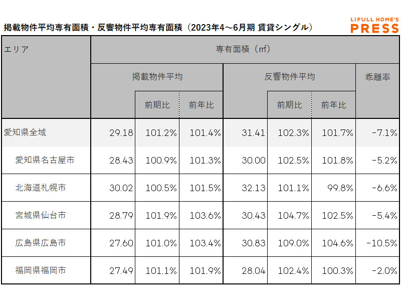 2023年4~6月期の愛知県および地方4市(札幌市、仙台市、広島市、福岡市)のシングル向き賃貸物件の掲載物件平均専有面積および反響物件平均専有面積は以下の通り。
