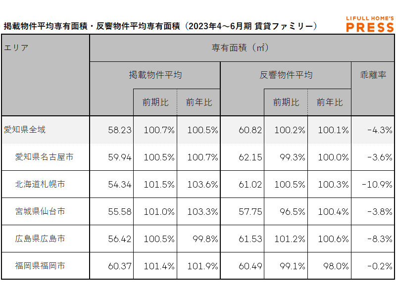 2023年4~6月期の愛知県および地方4市(札幌市、仙台市、広島市、福岡市)のファミリー向き賃貸物件の掲載物件平均専有面積および反響物件平均専有面積は以下の通り。