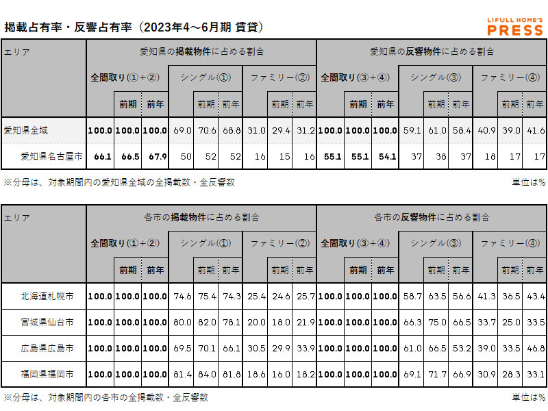 2023年4~6月期の愛知県および地方4市(札幌市、仙台市、広島市、福岡市)賃貸物件市場における、各エリアの掲載占有率および反響占有率は以下の通り。