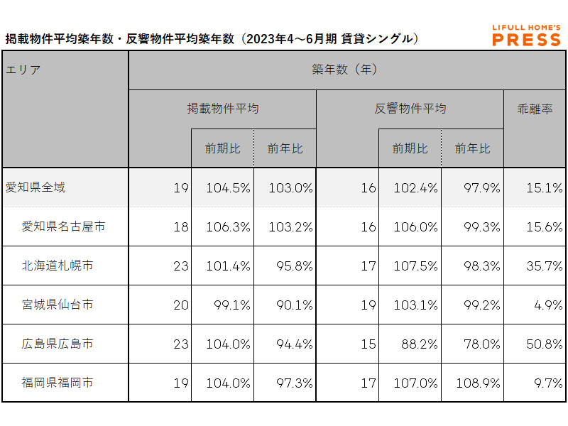 2023年4~6月期の愛知県および地方4市(札幌市、仙台市、広島市、福岡市)のシングル向き賃貸物件の掲載物件平均築年数および反響物件平均築年数は以下の通り。