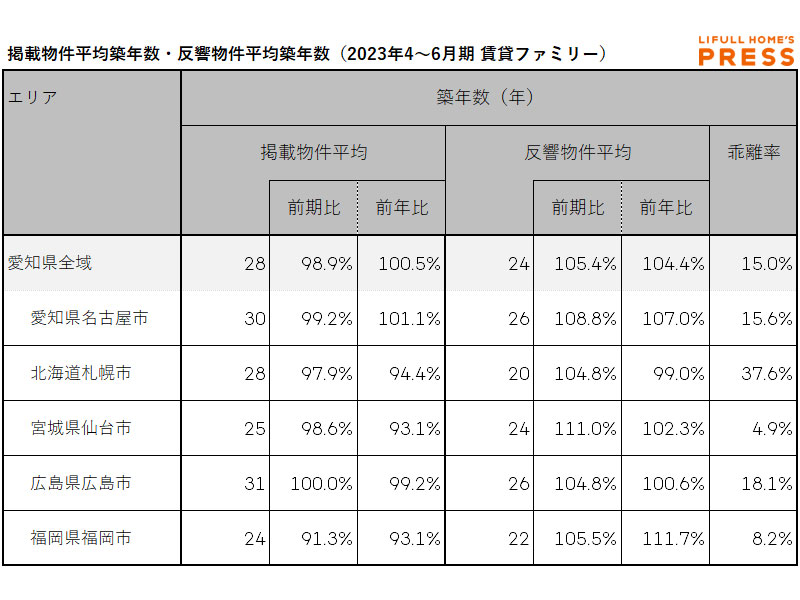 2023年4~6月期の愛知県および地方4市(札幌市、仙台市、広島市、福岡市)のファミリー向き賃貸物件の掲載物件平均築年数および反響物件平均築年数は以下の通り。