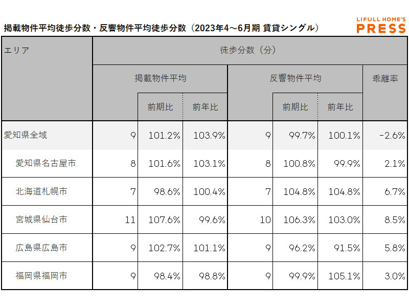 2023年4~6月期の愛知県および地方4市(札幌市、仙台市、広島市、福岡市)のシングル向き賃貸物件の掲載物件平均徒歩分数および反響物件平均徒歩分数は以下の通り。