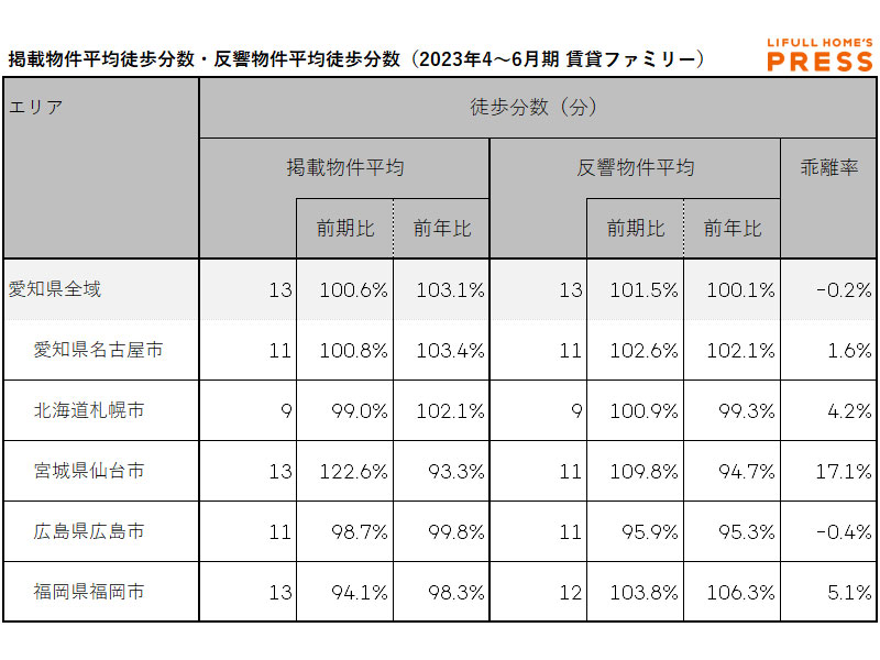 2023年4~6月期の愛知県および地方4市(札幌市、仙台市、広島市、福岡市)のファミリー向き賃貸物件の掲載物件平均徒歩分数および反響物件平均徒歩分数は以下の通り。