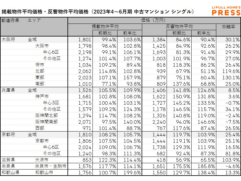 掲載物件平均価格は大阪府が1,801万円で前年比103.6%・前期比99.4%、兵庫県が1,526万円で前年比109.9%・前期比105.5%、京都府が1,810万円で前年比105.7%・前期比108.2%となっている。