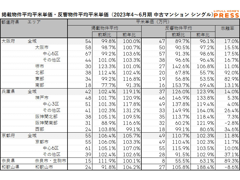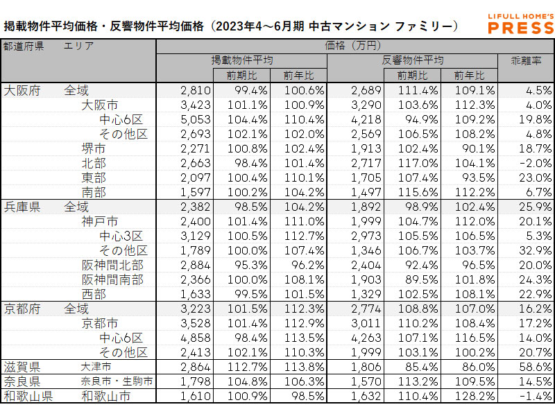 掲載物件平均価格は大阪府が2,810万円で前年比100.6%・前期比99.4%、兵庫県が2,382万円で前年比104.2%・前期比98.5%、京都府が3,223万円で前年比112.3%・前期比101.5%となっている。